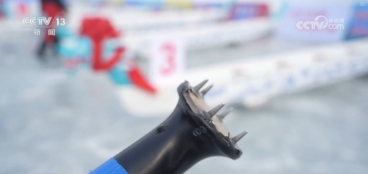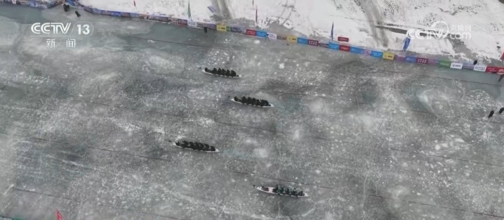 随着裁判一声令下,运动员们全力挥动手中的冰钎扎向冰面,龙舟快速向前冲去。冰上龙舟每艘长度在10米,比赛时配有鼓手、舵手和划手,与传统水上龙舟不同,冰上龙舟的核心装备是安装在船体下方的冰刀和运动员手中的特制冰钎。
