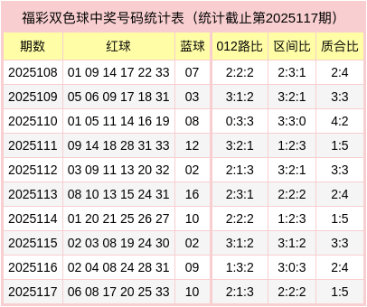红球三区比2:2:2,质合比为1:5,012路比为2:1:3,蓝球为合数、1路号码。