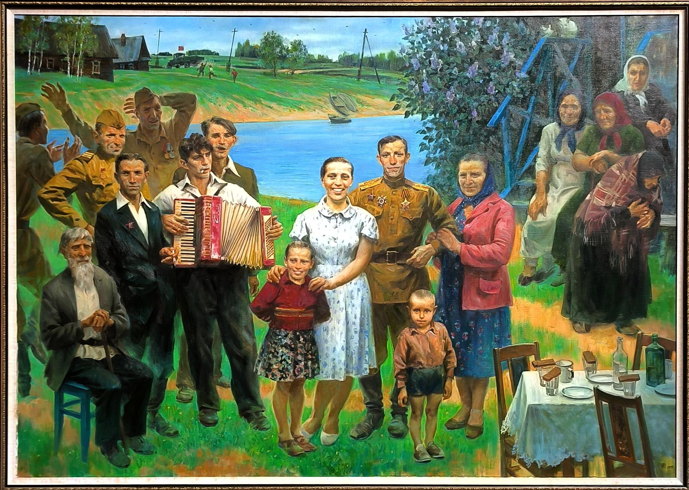 创作者伊利亚·奥夫恰连科以精湛的写实技法和对当代社会问题的深刻洞察而闻名。他的作品常常描绘苏联解体后俄罗斯社会中的普通人物,风格细腻,情感饱满,带有一种宁静而忧郁的叙事性。 《胜利日》创作于2015年,在世界反法西斯战争胜利70周年的时间节点上,这幅作品的诞生具有非凡的意义。画面的构图极具巧思,它没有直接描绘战场的硝烟,而是将视角聚焦战争胜利后的家庭团聚草地野餐的瞬间。 类似合影的群像排列,画面老者稳坐,后面三位身着军服的士兵欢呼雀跃。前景为母亲扶着儿子,一家四口处于画面的中心形成一组主体人物。周围人们庆祝胜利日子,拉着手风琴,右侧三位女士面带微笑远远观看,好似为军人归来团聚的祝福。远处的风景为乡村的农场,硝烟已经逝去,战争已经结束,和睦的生活已经到来。 伊利亚·奥夫恰连科的《胜利日》是一幅具有深刻人文关怀和极高艺术水准的油画。作品继承了俄罗斯巡回展览画派深厚的写实传统,以浓烈的色彩,现实主义的表现方法表现了胜利日团聚的一家。通过精湛的写实技巧和复杂的情感表达,成功地将一个宏大的国家叙事,转化为一个触手可及、感人至深的集体故事。它告诉我们,胜利日的真正意义,不仅在于庆祝一场战争的结束,更在于铭记历史,向往和平。 “人民必胜——中俄美术作品展”在长春美术馆持续开展至11月30日,欢迎广大书画爱好者、市民、游客前来参观。 展览地点:长春美术馆(长春市南关区华运路111号) 交通路线:可乘坐地铁1号线、轻轨3号线至卫星广场站转乘15/G15到市规划馆站、Z307幸福东路站下车南行200米。 中国吉林网 吉刻新闻记者 丛鹂锐 文/图/摄 制作 赵少浦 |
