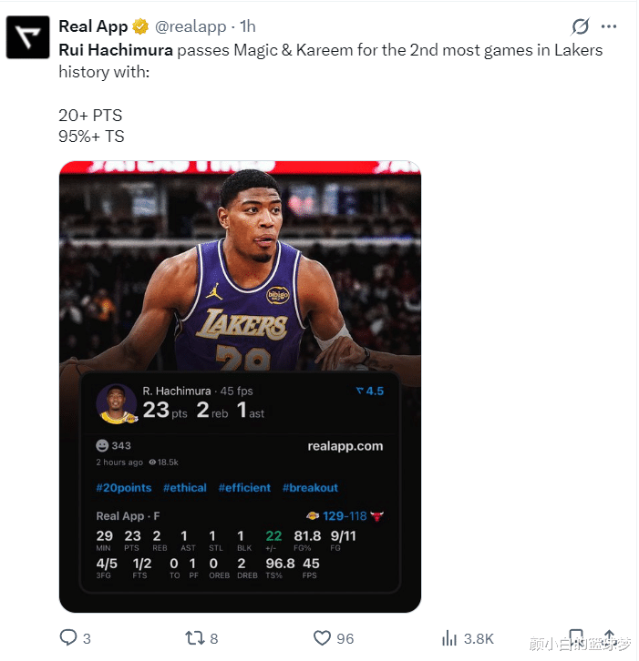这场比赛后八村垒超越魔术师、贾巴尔成为湖人队史拿下20+真实命中率95%以上第二多的球员,队史第一是拜伦-斯科特4次。
