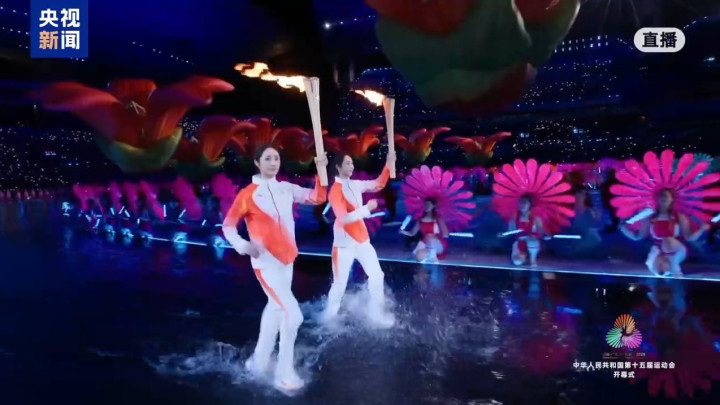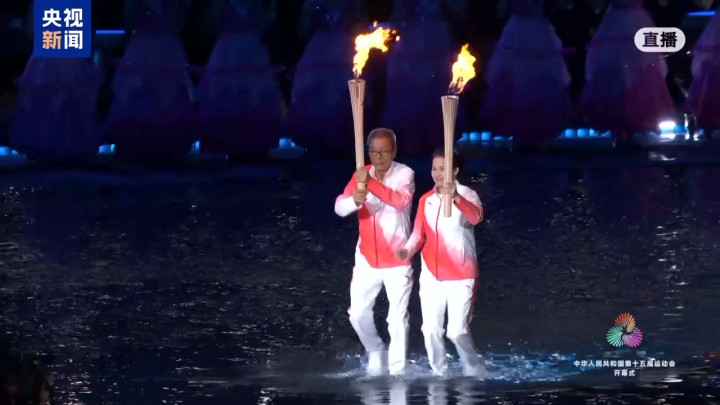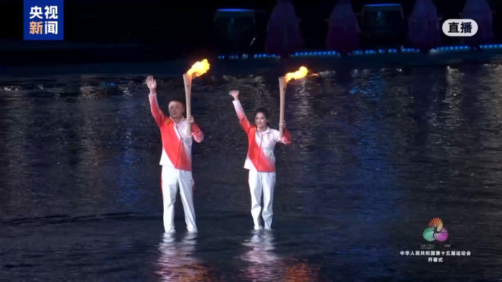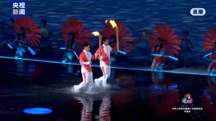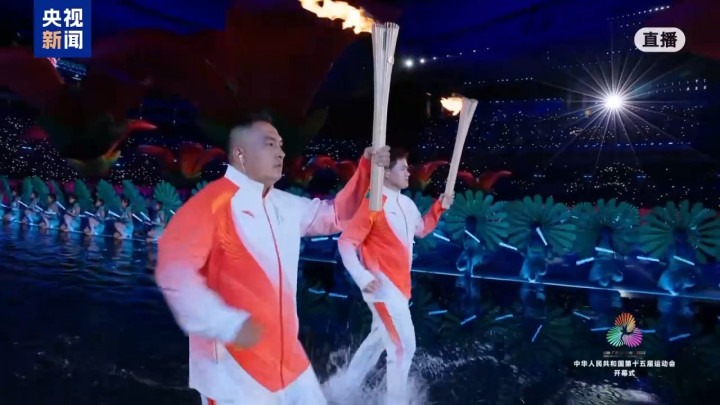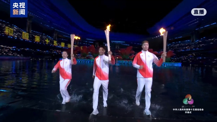 | 11月9日20时,十五运会开幕式在广东奥林匹克体育中心举行。在开幕式主火炬点燃仪式中,来自全国的优秀运动员代表手持采自南海1522米深处的圣火踏浪而来,经过传递,最终由来自粤港澳三地的火炬手苏炳添、张家朗、李祎最终共同点燃圣火。
