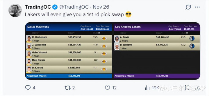 湖媒模拟了一套方案,湖人用:八村垒、范德比尔特、文森特、克勒贝尔、克内克特、1个未来首轮互换权从独行侠换回浓眉、布兰登-威廉姆斯。