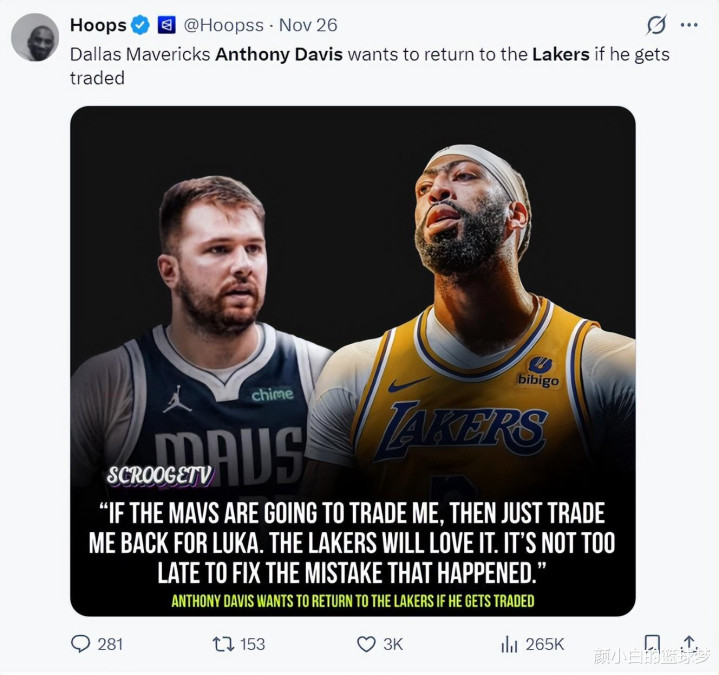 此前ESPN与TA都纷纷报道,本赛季的达拉斯独行侠考虑以弗拉格为核心重建,凯利-欧文大概率赛季报销,但独行侠不愿意交易欧文,安东尼-戴维斯大概率会是送走的对象。 11月26日时,美媒Hoops报道,如果安东尼-戴维斯被交易,那么他愿意重返洛杉矶湖人队。不过浓眉的原话带有调侃的性质,他说的是用他换回卢卡纠正双方交易的错误。