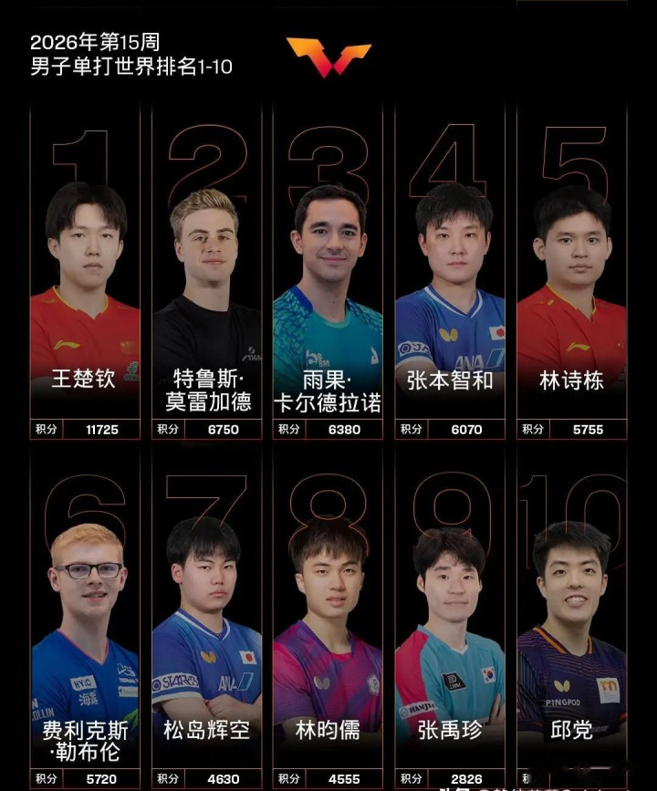 男单这边形势明显不如女队,世界前十里面国乒只有王楚钦和林诗栋两个人,其余八个位置全部被外协选手占据。