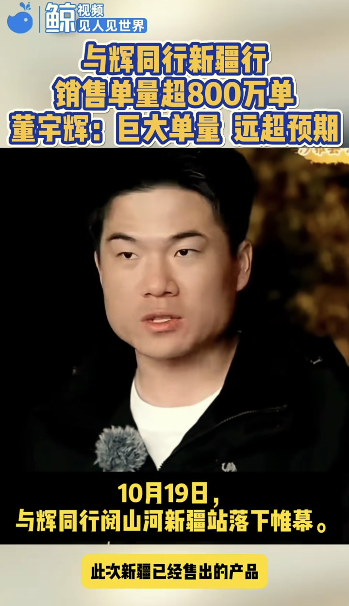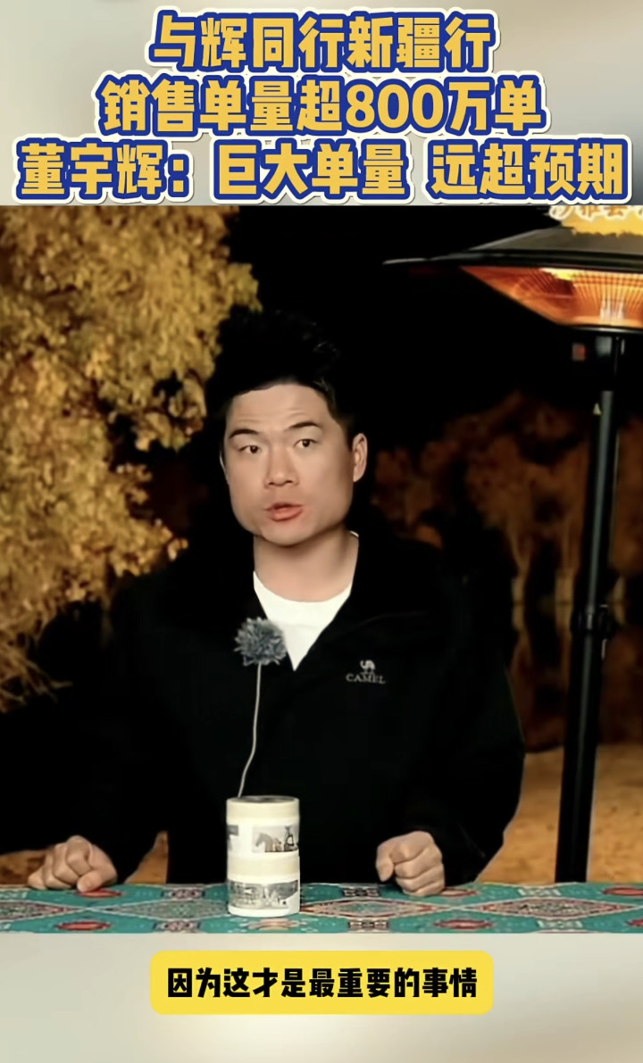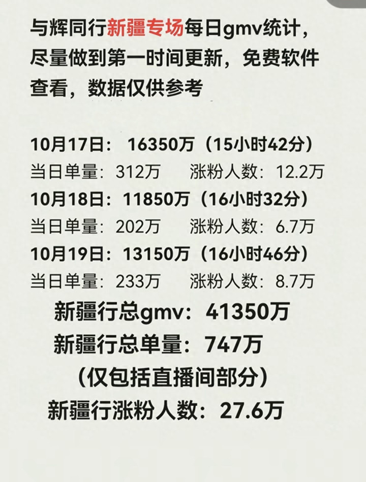 | 10月19日晚,在新疆沙雅县“沙雁洲景区”的“与辉同行直播间”,董宇辉在即兴做了近40分钟的高能精彩总结后,就为这次为期三天的新疆行落下了帷幕。现在回头来总结这次新疆行,光从各项最直观的数据上,就可以知道这次短短三天的新疆行有多成功。首先光三天的累计销售数据就高达4.135亿(17号1.635亿,18号1.19亿,19号1.131亿),日均1.378亿,其它数据先不说,就光这个销售数据,就已经打破了自“与辉同行阅山河”栏目开播以来的各场历史数据,直接创出了一个新高数据。这个炸裂惊艳的销售数据固然让人惊喜,但对比这个数据,在这次新疆行中,宇辉做的以下三件事反而更有价值!