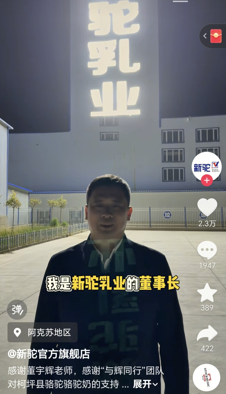 像其中一款出自“新驼乳业公司”的骆驼奶,据这家公司的老板透露,这次新疆行宇辉他们帮忙卖出了8万多单,价值近2000万的骆驼奶,为他们这款原本是当地的小众奶打开全国市场和知名度,并帮助带动当地8000多户骆驼奶农增收。