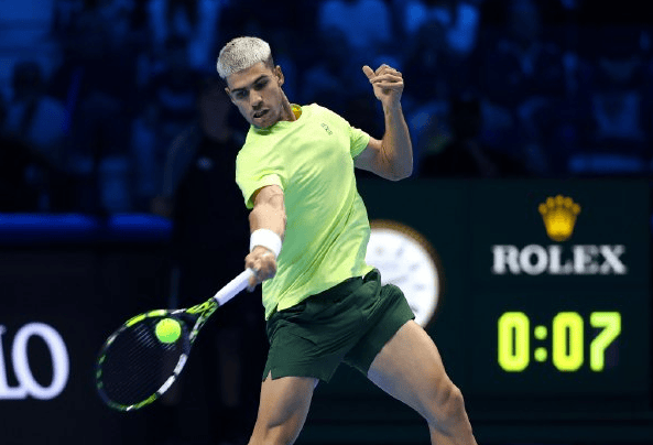 虎扑11月09日讯ATP年终总决赛小组赛首轮,世界第二阿尔卡拉斯7-6(5)、6-2战胜世界排名第7的德米纳尔,职业生涯首次在总决赛取得小组赛开门红。 第一盘,阿尔卡拉斯在第4局率先完成破发并以4-1领先。德米纳尔在第6局0-40落后连下5分保发,随后在第7局完成回破。之后双方互保发球局,阿尔卡拉斯在抢七3-5落后连得4分以7-5惊险拿下。 第二盘,阿尔卡拉斯3破德米纳尔发球局,以6-2再胜一盘,大比分2-0锁定胜局。 第二轮,阿尔卡拉斯将迎战穆塞蒂和弗里茨之间的胜者。 |